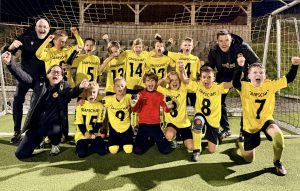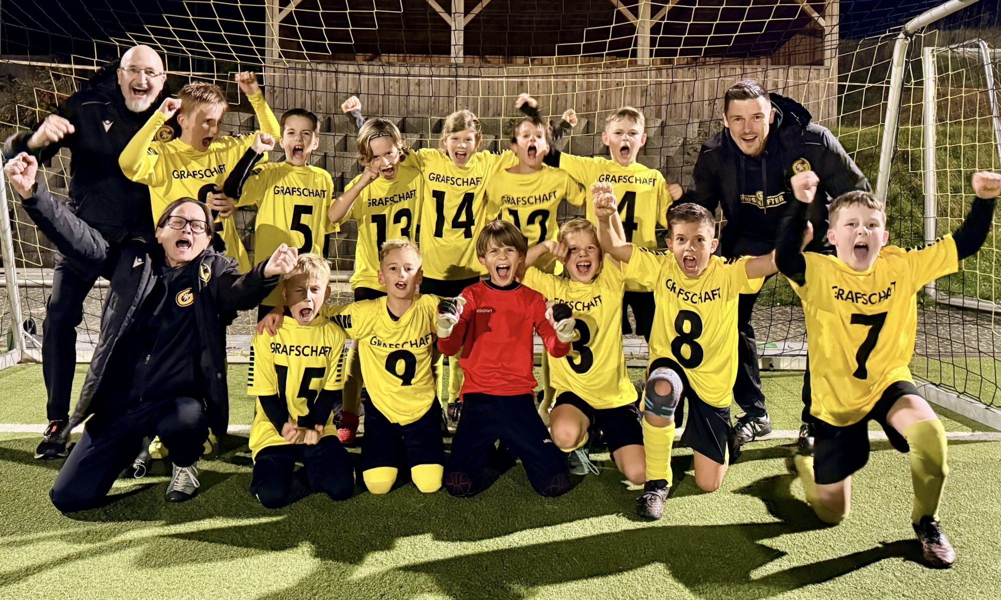 Bei bestem Flutlichtambiente auf dem heimischen Kunstrasenplatz sorgte die JSG Grafschaft E II am Freitagabend für ein echtes Fußballfest. Die jungen „Löwen“ hatten Eltern, Geschwister und Großeltern eingeladen undboten ihnen zum Abschluss der Hinrunde einen beeindruckenden 7:0 Erfolg gegen die SG Westum II. Nach einem kurzen Abtasten übernahm die Grafschafter ab Mitte der ersten Halbzeit komplett die Kontrolle. Angriff um Angriff rollte auf das Tor der Gäste und innerhalb weniger Minuten fielen drei Treffer. Kurz vor der Pause erhöhte das Team verdient auf 4:0. Auch im zweiten Durchgang spielten die Gastgeber konzentriert weiter. Mit schönen Kombinationen und schnellen Doppelpässen legte die E II weitere drei Tore nach und belohnte sich und die Fans mit einem klaren 7:0 Endstand. Das Trainerteam um Petra Löhndorf, Markus Albring und Patrick Plath sind hochzufrieden. Besonders bemerkenswert ist die Leistung seit Saisonstart angesichts des kleinen, geschwächten Kaders und der Tatsache, dass die Mannschaft häufig als jüngerer Jahrgang antreten musste. „Chapeau – sehr gut gemacht!“, so das Trainer-Trio. Ein besonderer Dank ging zudem an Schiedsrichter Benno Pischnoth, der die Partie einmal mehr, souverän leitete.