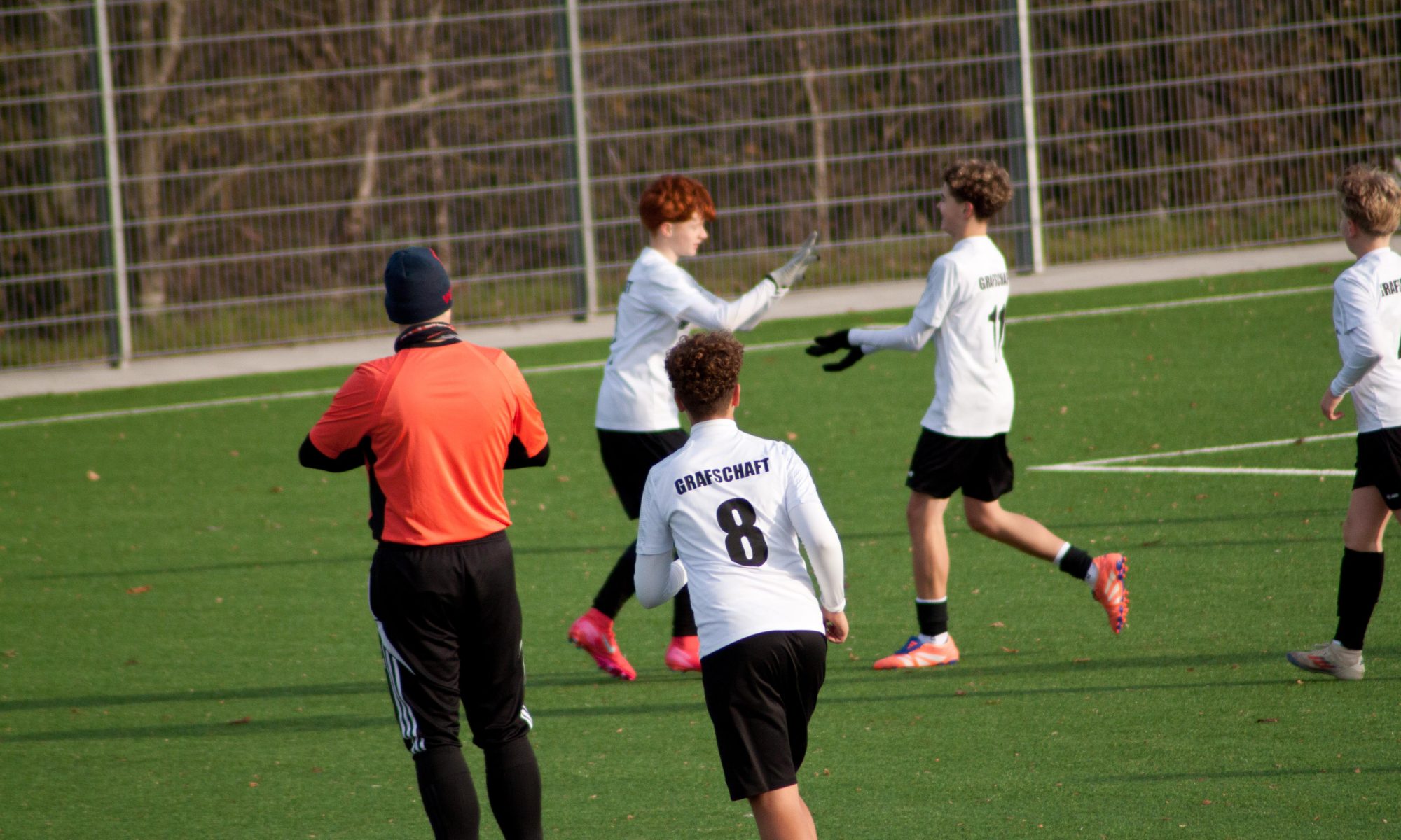 Am 22.11. empfing die Mannschaft von Martin Schell und Andreas Kunze den JFV Rhein-Hunsrück 2. Bei kaltem, aber sonnigen Wetter konnten die Grafschafter mit einem überzeugenden 5:0 Sieg eine sehr gute Vorstellung abliefern. Von der ersten Minute an dominierten die Grafschafter und ein frühes Tor durch Jayson Ball brachte zusätzliche Sicherheit. Schnelle Angriffe und präzises Passspiel brachten die Grafschafter immer wieder gefährlich vor das gegnerische Tor, wodurch Senan Nienaber zum 2:0 erhöhen konnte und nur wenige Minuten vor der Pause setzte Janick Lohmann zum 3:0 noch einen drauf.