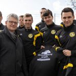 Stolz präsentieren die GSG 2-Spieler um ihren Mannschaftskapitän Mario Pluschke gemeinsam mit Claus-Dieter Grießel die neuen Aufwärmtops im mittlerweile gewohnten Schwarz-Gelb. Mit neuen Aufwärmtops können …